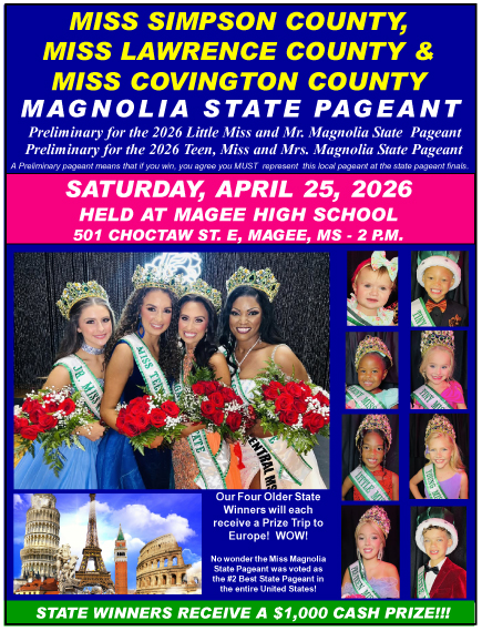This is an official preliminary pageant to the Miss Magnolia State Pageant to be held in Vicksburg September 19-20, 2026 for ages 0-11