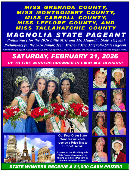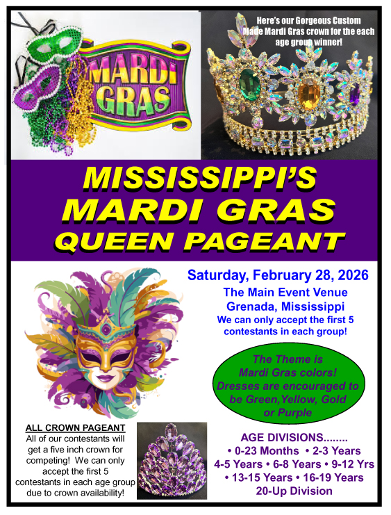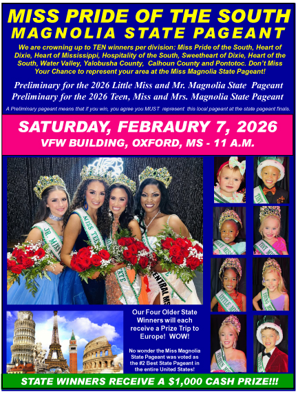 This is an official preliminary pageant to the Miss Magnolia State Pageant to be held in Vicksburg September 19-20, 2026 for ages 0-11