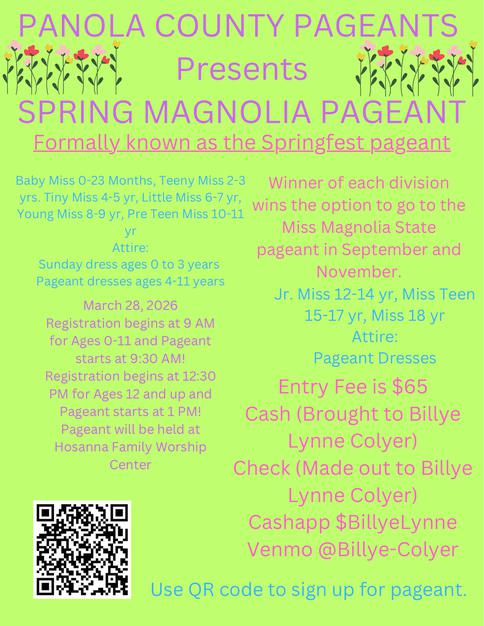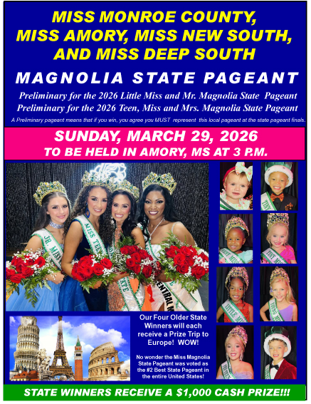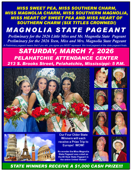 This is an official preliminary pageant to the Miss Magnolia State Pageant to be held in Vicksburg September 19-20, 2026 for ages 0-11